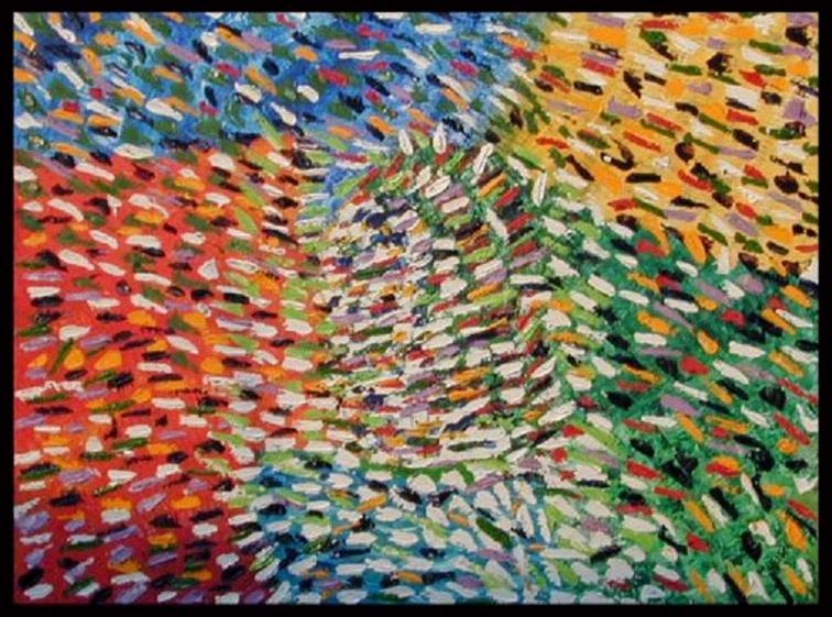 Each imaginative piece by this Oslo based artist seems to draw the viewer into colourful "imaginations", fabricated through free-form oils and acrylics. Often her pieces are created on four or five foot canvases, the scale of which enhances the intoxicating visual impact. The creative elements that Michelle inserts into her compositions can largely be interpreted by the viewer and do not always represent symbolism. Instead, she tends to lean toward the importance of spatial relationships between imagery rather than trying to carry underlying messages.