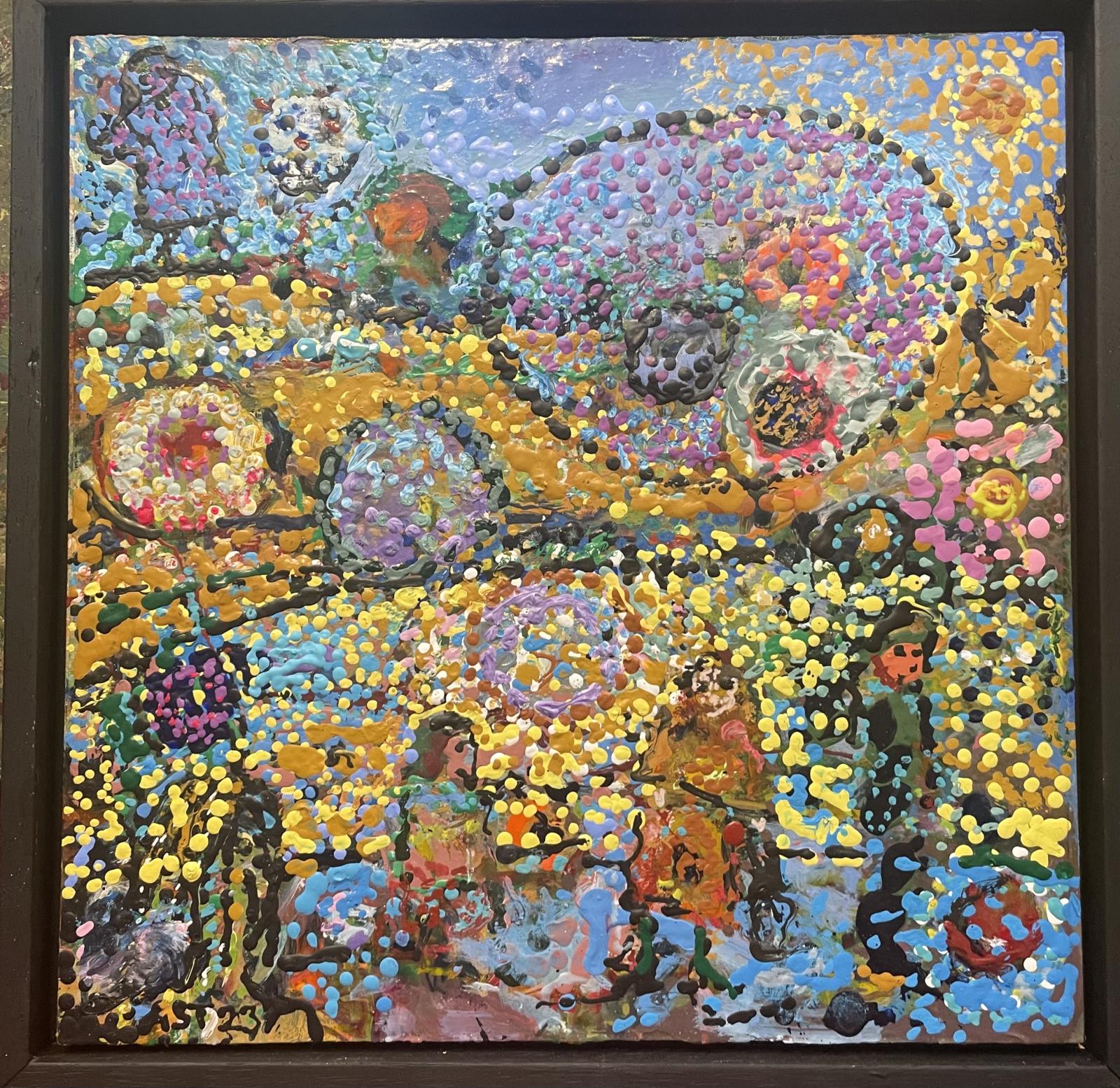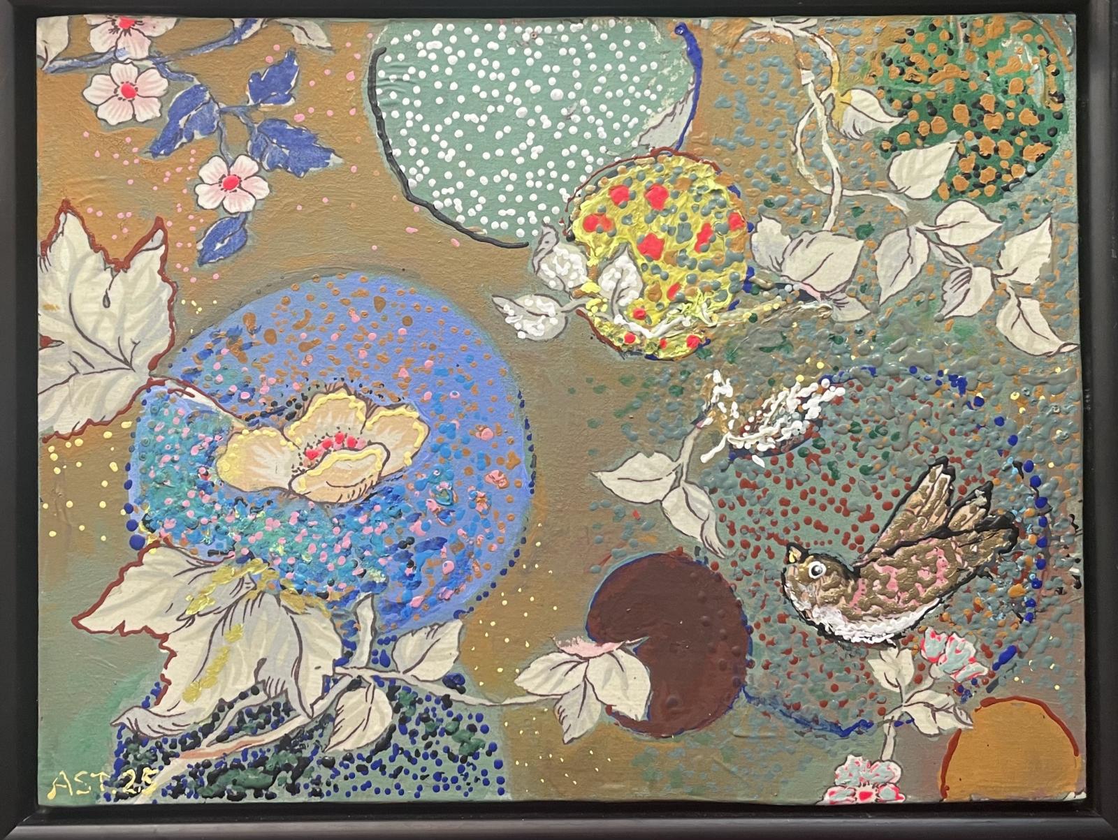 De fleste arbeidene som blir vist i S9 Galleri er forholdsvis abstrakte. Fargebruken er viktig, men i de siste årene har jeg også vært fokusert på selve fargeflaten. Av og til lar jeg flaten stå monokrom, men oftest gjør jeg sjatteringer. Prikking eller dotting har blitt min «greie». Med prikking av små fargefelt oppstår en optisk vibrasjon og jeg synes det gir et mer levende uttrykk. Jeg lar meg fascinere av aborginske kunstuttrykk, de er abstrakte men utstråler harmoni og kraft.