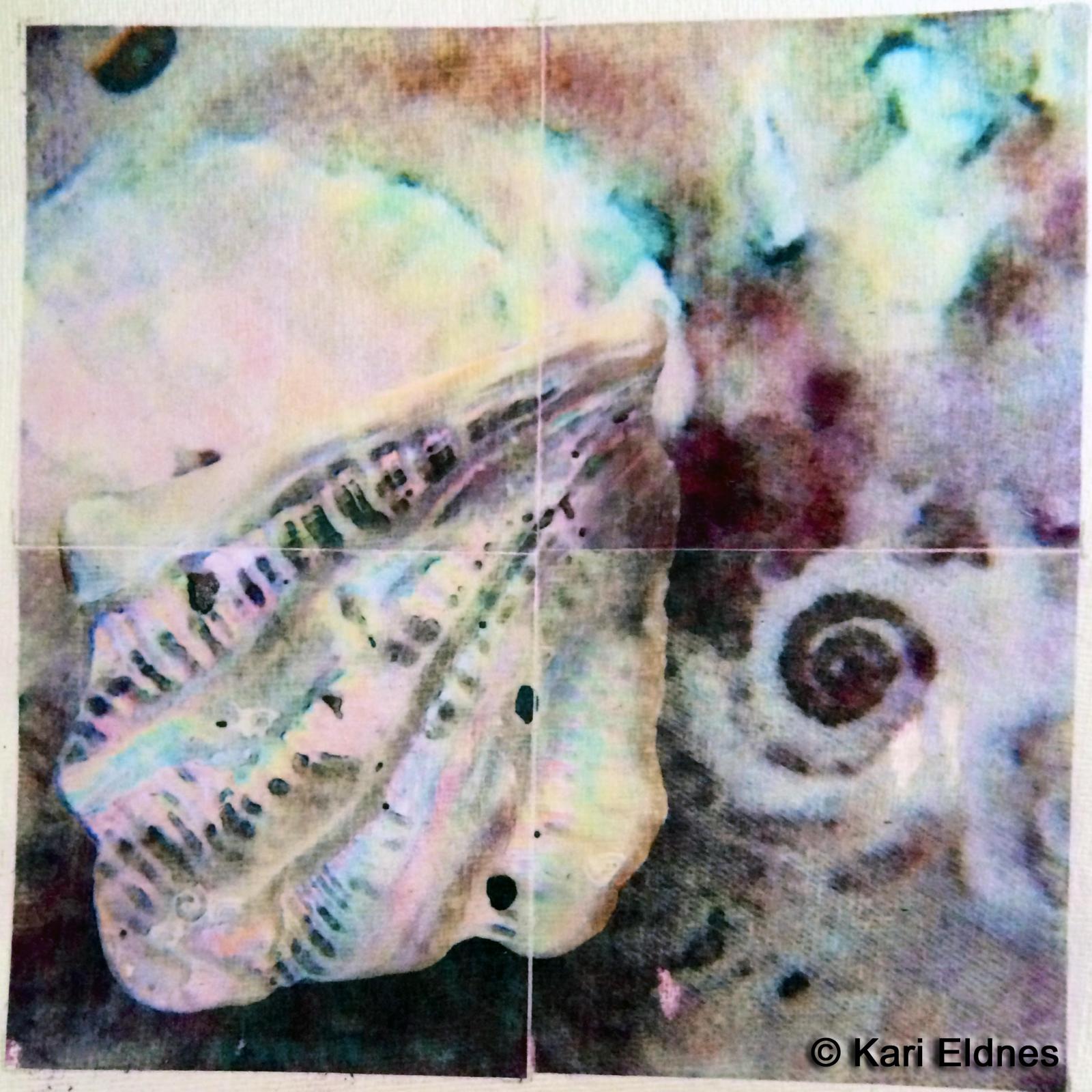 Kari Eldnes, fotografi/acryl på khadipapir - Kari Eldnes har hentet motivene sine fra en verden nesten usynlig for det blotte øye. Bittesmå skjell i vakre og intrikate mønster og farger åpenbarer seg i disse arbeidene. Med spektakulære utsnitt og forstørrelser viser hun oss havets skatter og deres utrolige detaljrikdom. Khadipapiret gir motivene ytterligere en dimensjon, og reslultatet er svært vakkert. Det er fra lengre opphold i Spania hun har hentet inspirasjon og motiv til dette prosjektet.