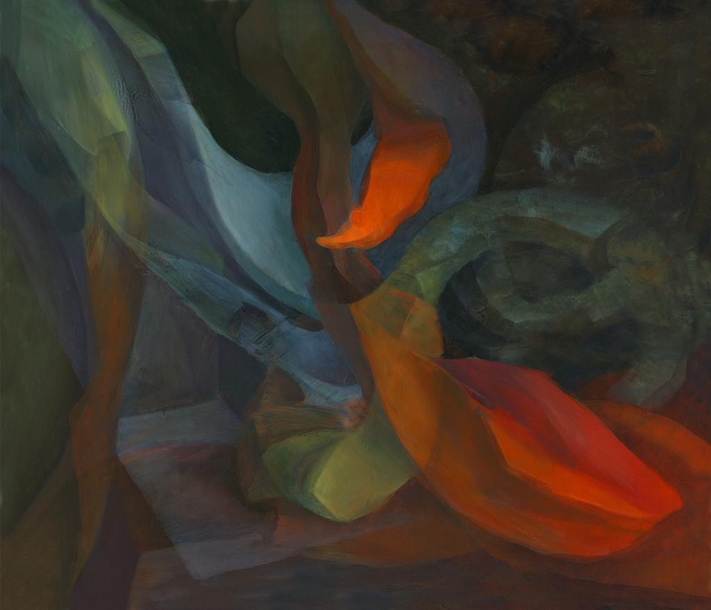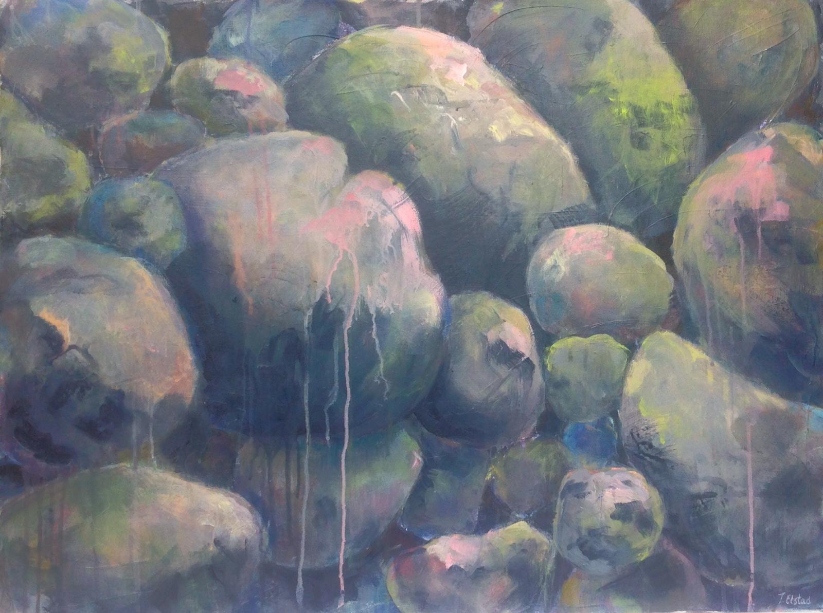 Trude Elstad, maleri - Steiner har alltid fasinert meg, sier Trude Elstad. Med sine utrolige former, struktur og fargespill, med sine spor og historier. På mine turer i naturen fotograferer jeg steiner sett rett ovenfra, som en stor usystematisk masse. Under arbeidet med maleriet henter jeg abstrakte former – steiner – fram i lyset. Jeg utforsker fargene i forhold til formene, og i prosessen tenker jeg ikke naturalistisk, og om hva som er riktig i lys, skygge og dybde. Teknisk jobber jeg mye med transparente, gjennomskinnelige farger og utforsker hvordan disse fargene kan skape dybden i mine former. Jeg ønsker å finne sanseligheten mellom det transparente og det tette, og ta vare på det kraftfulle mot det gjennomskinnelige. Stein representerer svunnet liv – fortidens flora og fauna.