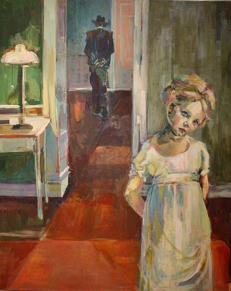 Stig Nesvik: "Forgreininger og drypp der ingen kikker inn". Arbeidene er i hovedsak 5-7 oljemalerier og 3 fotografier laget i 2014 som han velger å oppsummere med teksten "Bak de innerste stjernedrypp" - Ingen port knirker slik, når hun åpner den røde myra si. Bakom de innerste drypp fra blodsprengte greiner speiler hun seg i små vak. Vannet skjermer ingen her, ringene omkring utvider ingenting. Hun sover i bevegelsen imot vannet, sover under og med vannet, våkner som drypp fra vannet.