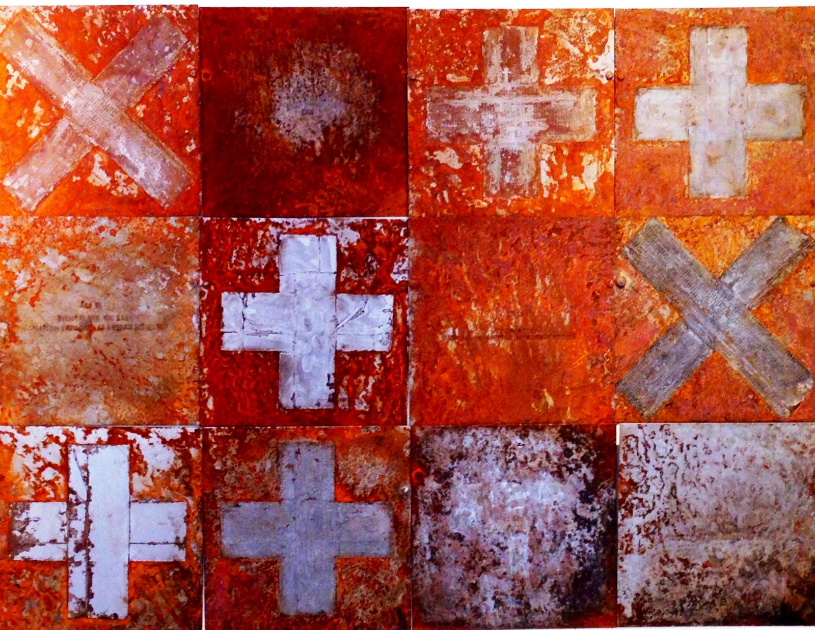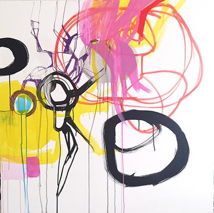 Camilla Dahl jobber med utgangspunkt i billedflaten i flere teknikker; akryl, papir, metall og tekstil.