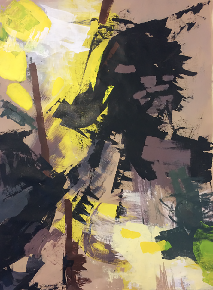 Farger, musikk og ordløse energier er viktige elementer jeg bruker for å sette i gang prosessen. Jeg undres over hvorfor uttrykket gjentar seg og overraskes av samtalen med bildet og jeg fasineres av hvordan det er mulig å gjenskape en følelse gjennom farger, former og performative handlinger.