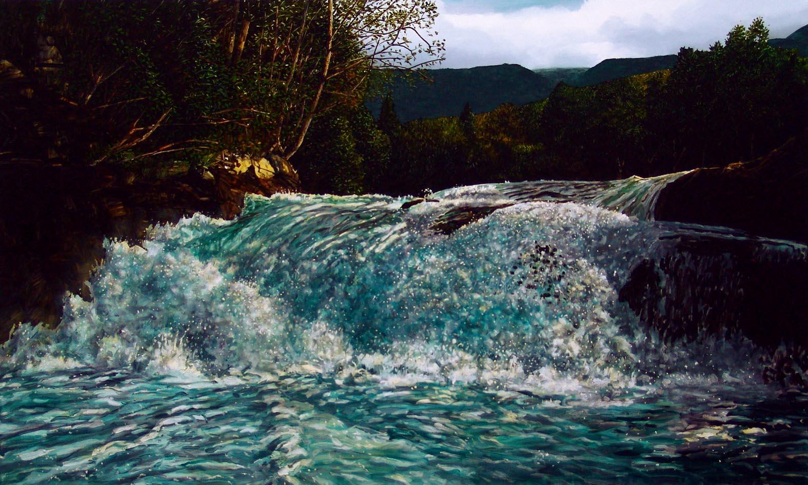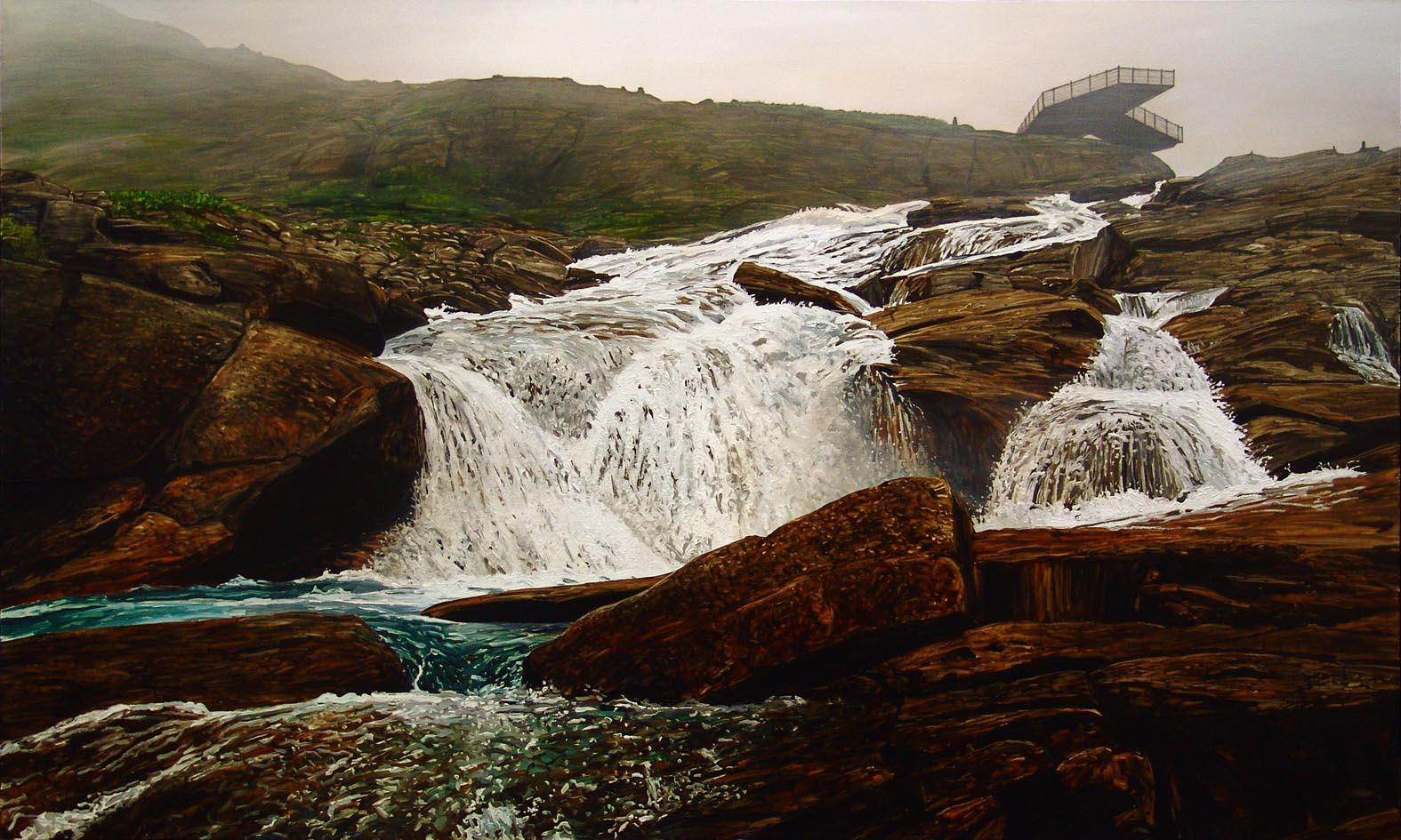 Jeg var basert hovedsakelig i Lom i hjertet av Jotunheimen. Temaet i serien strekker seg fra Solvorn i Sognefjorden, over Sognefjellet og Jotunheimen Nasjonalpark og opp til Geirangerfjorden og Trollstigen. Jeg var der over sommeren 2011, hvor synet og lyden av rennende vann var det samlende tema for disse landskapene. Bevegelige bilder, og hvordan de to mediene maleri og digital projeksjon kan kombineres, interesserer meg: Å lage "bevegelige malerier" som skifter og endrer seg ved hjelp av lys og tekstur på en kompleks måte - en etterligning av en etterligning som fortsatt beholder integriteten av tid og sted. Det beveger seg med motivet og skaper minner."